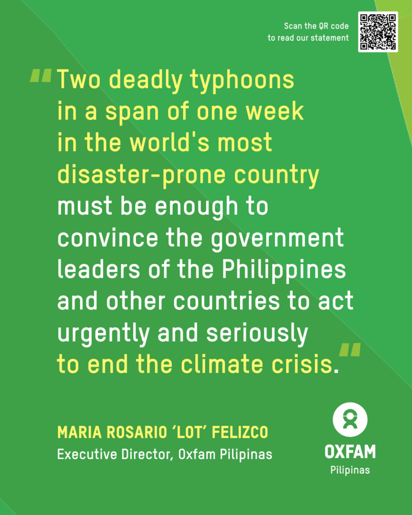 Responding to the impact of two deadly typhoons, Super Typhoon Fung-wong (local name: Uwan) and Typhoon Kalmaegi (local name: Tino), Maria Rosario Felizco, Oxfam Pilipinas Executive Director said: